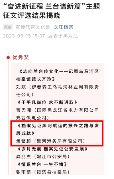 黑河港參加由黑龍江省檔案局、黑龍江省檔案館主辦,黑龍江省檔案學(xué)會(huì)、《黑龍江檔案》雜志社承辦的2023年國(guó)際檔案日“奮進(jìn)新征程 蘭臺(tái)譜新篇”主題征文活動(dòng)于近日?qǐng)A滿結(jié)束。經(jīng)過(guò)全省各級(jí)檔案部門(mén)精心組織,廣大檔案工作者積極參與,在936篇投稿中,經(jīng)征文評(píng)選委員會(huì)初審、復(fù)審、終審,最終綜合辦孟繁超同志代表黑河港的參賽征文脫穎而出,榮獲優(yōu)秀獎(jiǎng)。